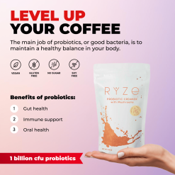 RYZE Probiotic Creamer is powered by 6 functional mushrooms and 1 billion CFU’s of probiotics. This creamy & delicious addition to your morning coffee keeps your body in balance and improves your gut health. Vegan. no added sugar. only 40 cal but still with a delicious. creamy vanilla taste in every sip.